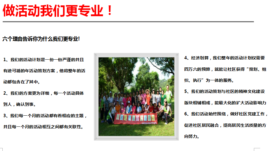 深入到社区的各类群体,开展相关的小活动,在活动主题不变动的情况下,针对各类的人群只变动活动的形式,做到更好的服务